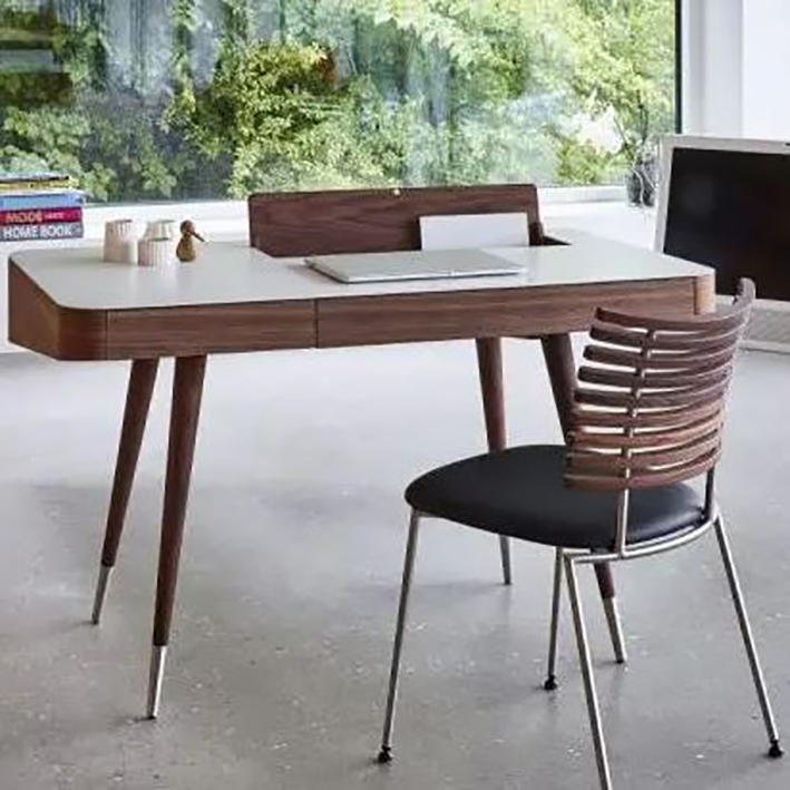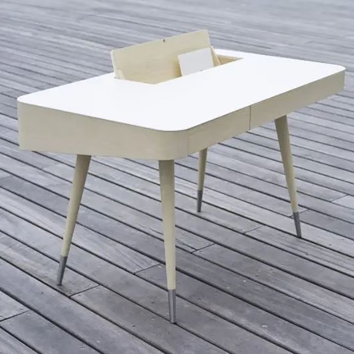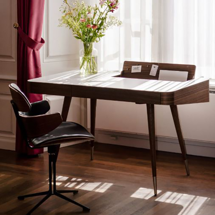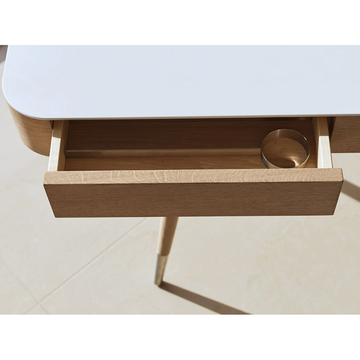 Plateau en Corian blanc avec couvercle ouvrant sur un compartiment de rangement. Il est équipé d’un tableau magnétique pour les notes. Un passe-câbles discrètement placé vous permet de dissimuler les chargeurs. Ce bureau est équipé de 2 tiroirs, conçus pour accueillir votre ordinateur portable et d’autres accessoires.