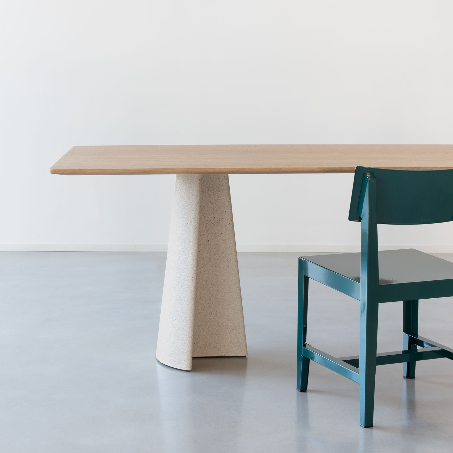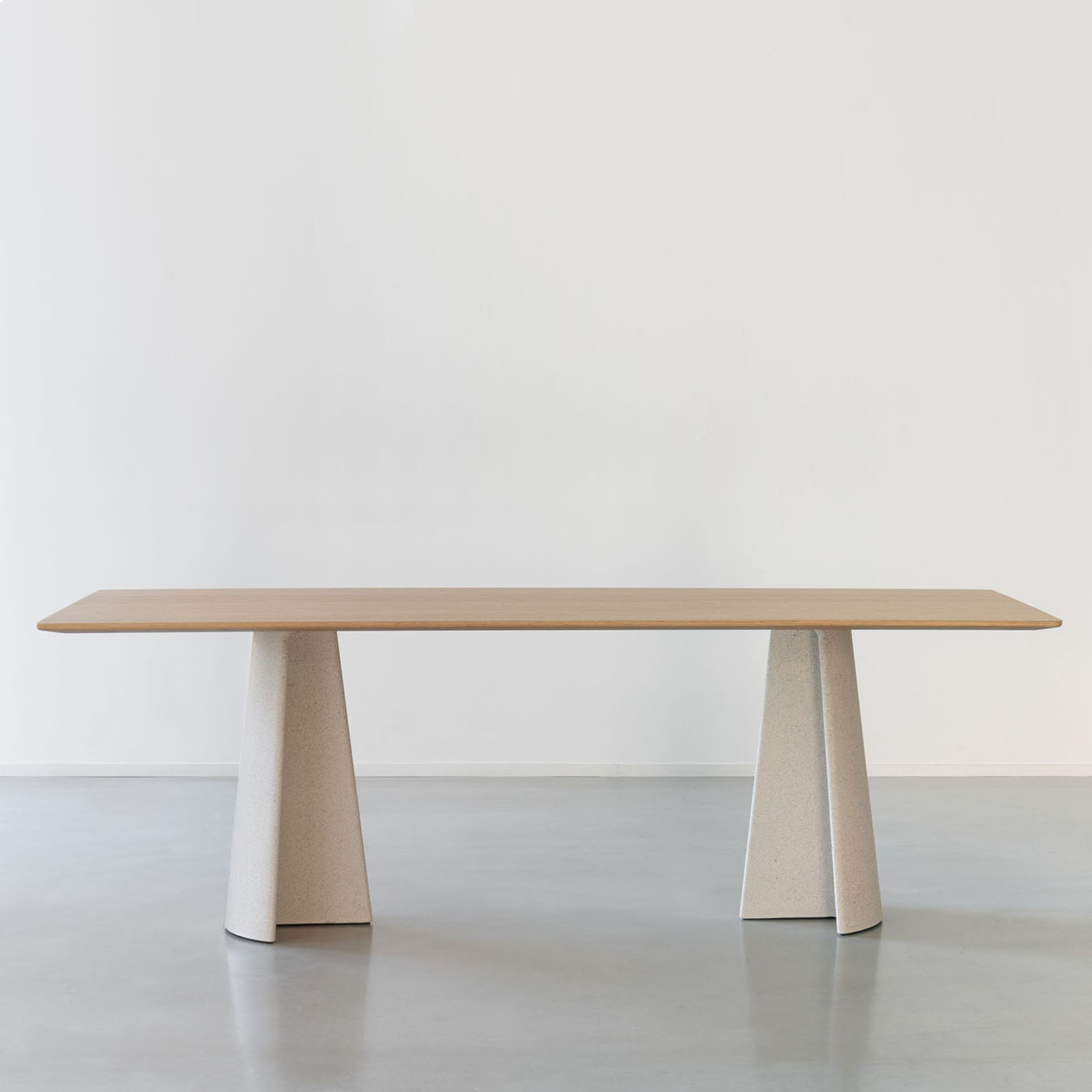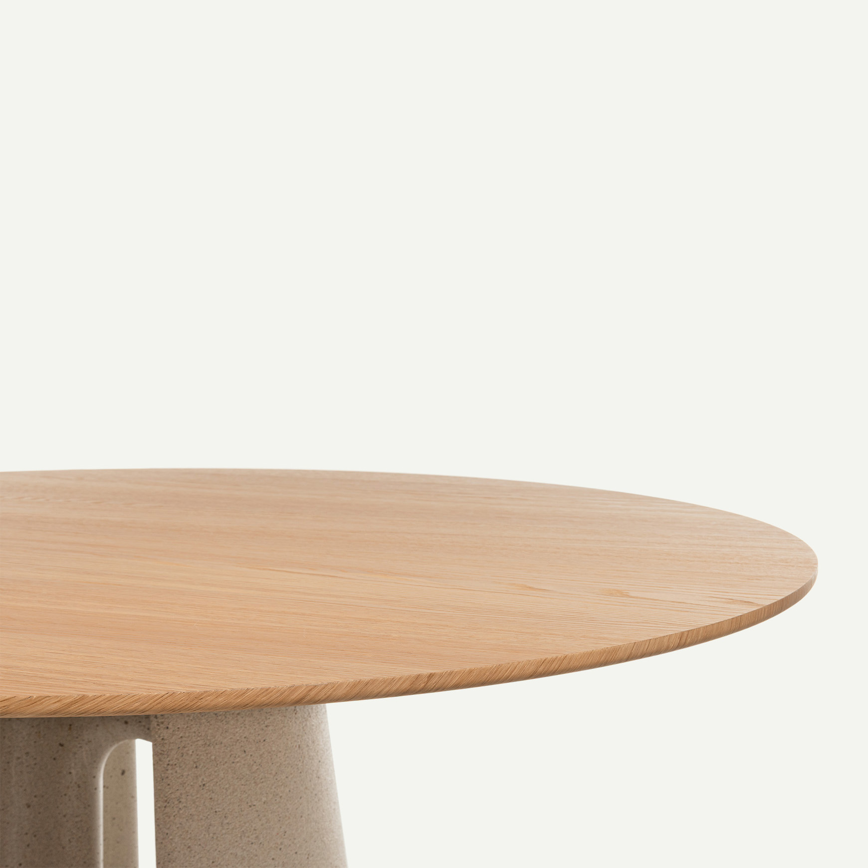 Base en béton. Plateau en verre trempé ou en MDF plaqué chêne.