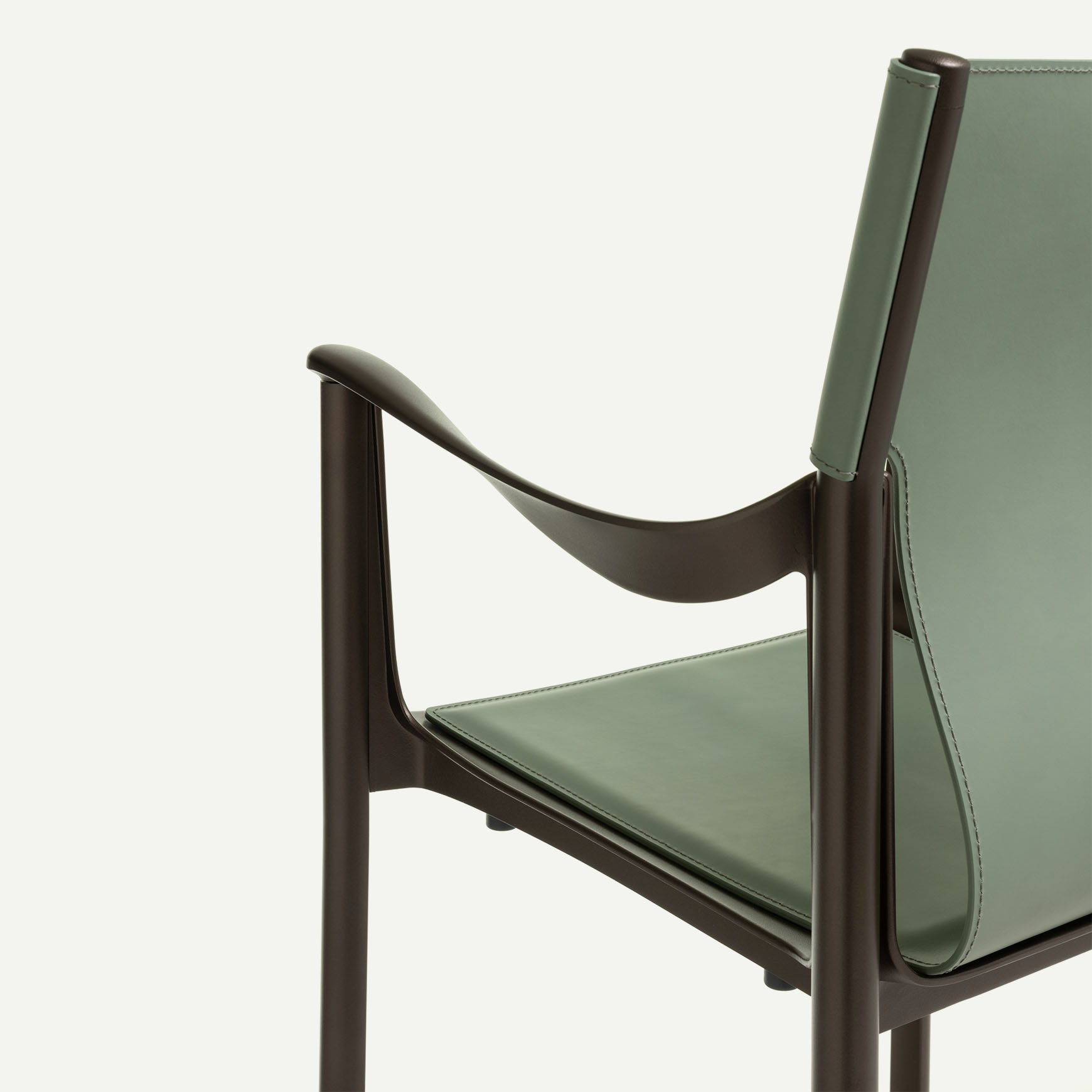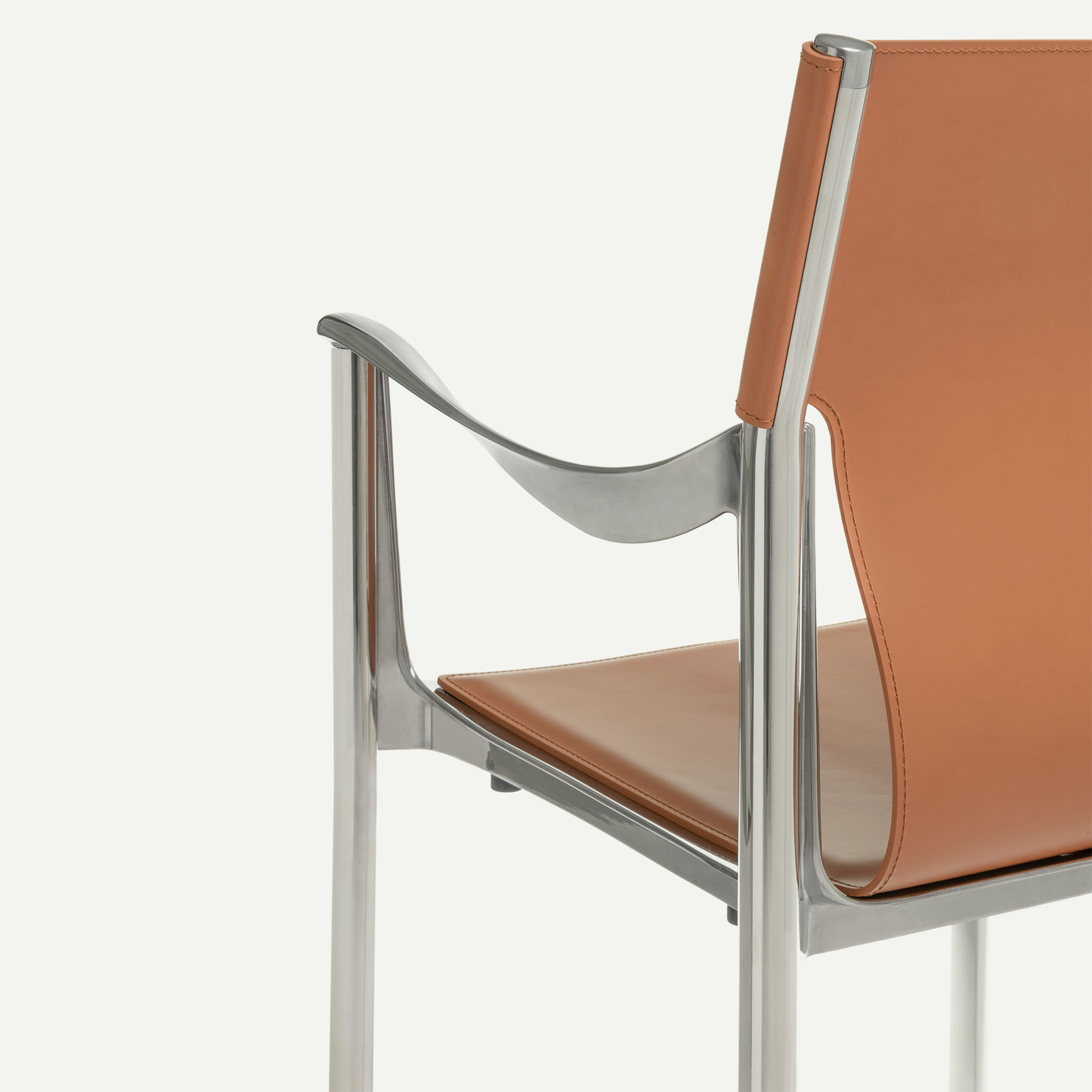 Assise en fonte d’aluminium verni en polyester ou poli. Pieds en aluminium verni en polyester ou poli. Assise et dossier en cuir.
