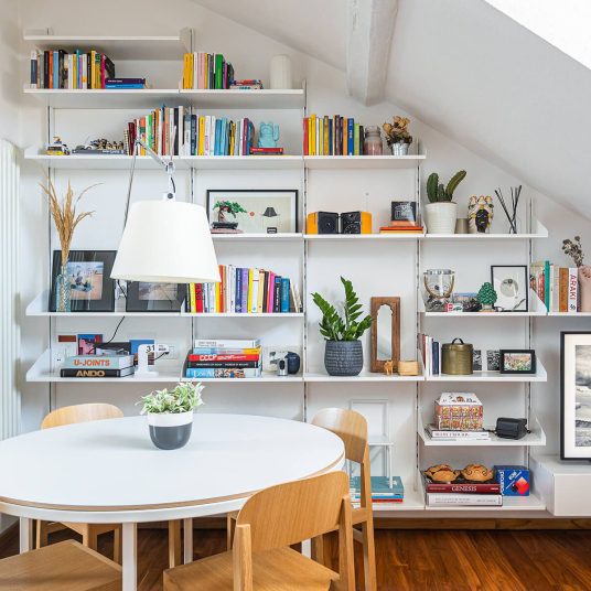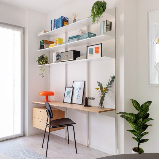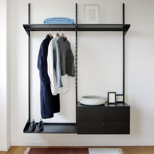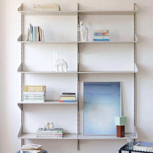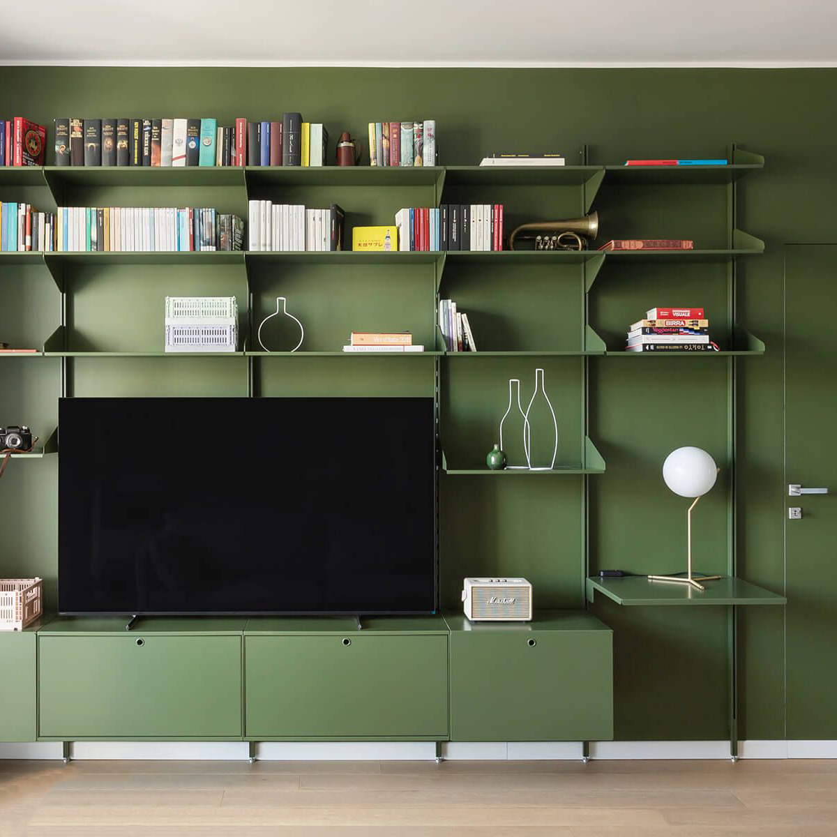 Système d’étagères modulaires avec montants en aluminium. La structure porteuse peut être fixée au mur ou sur pieds. Libre choix pour la position des éléments : étagères, bureaux et conteneurs.