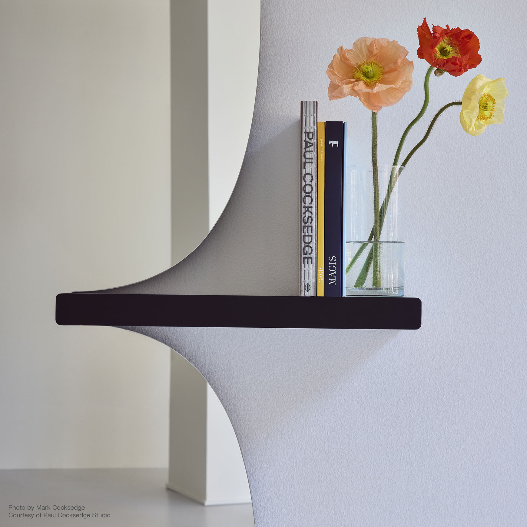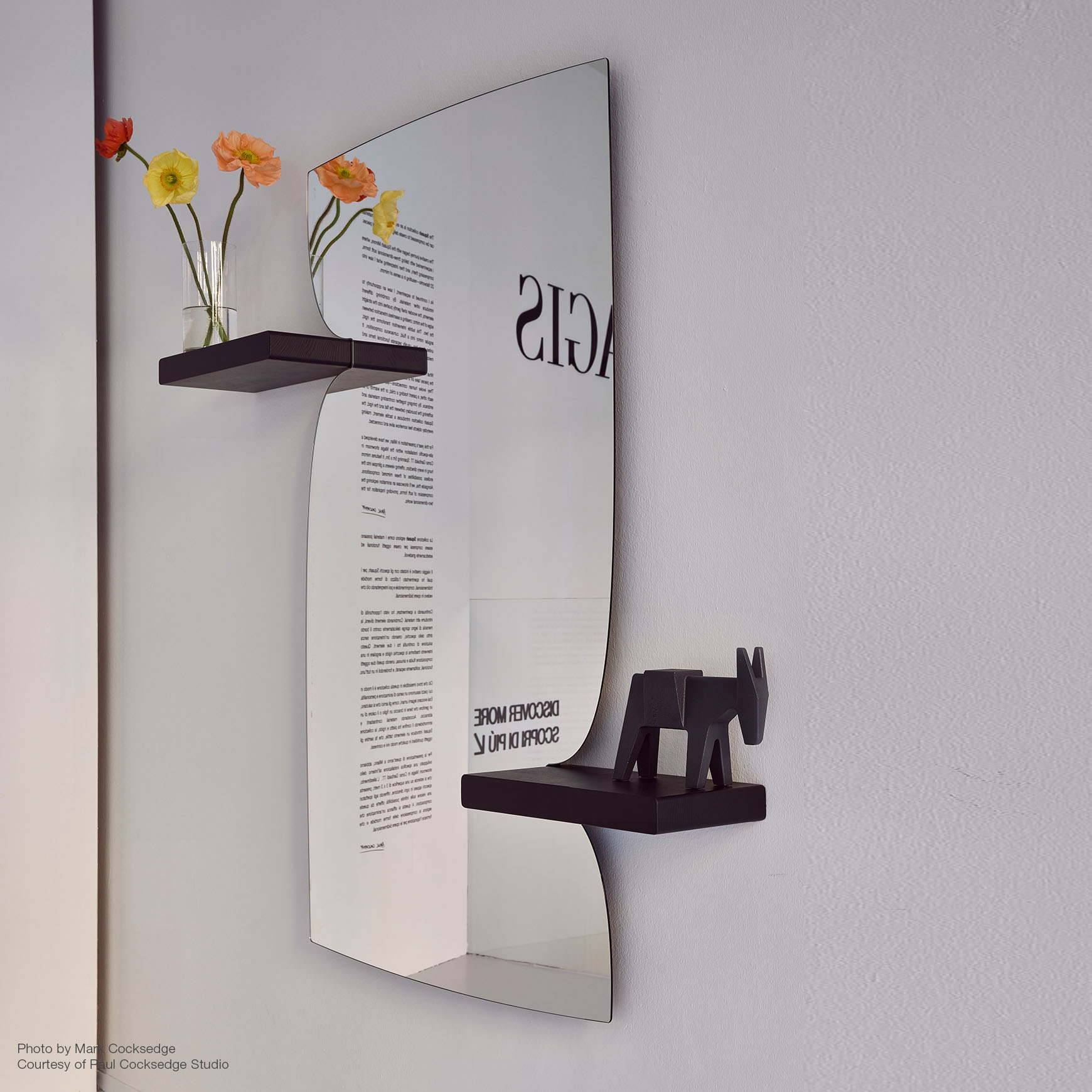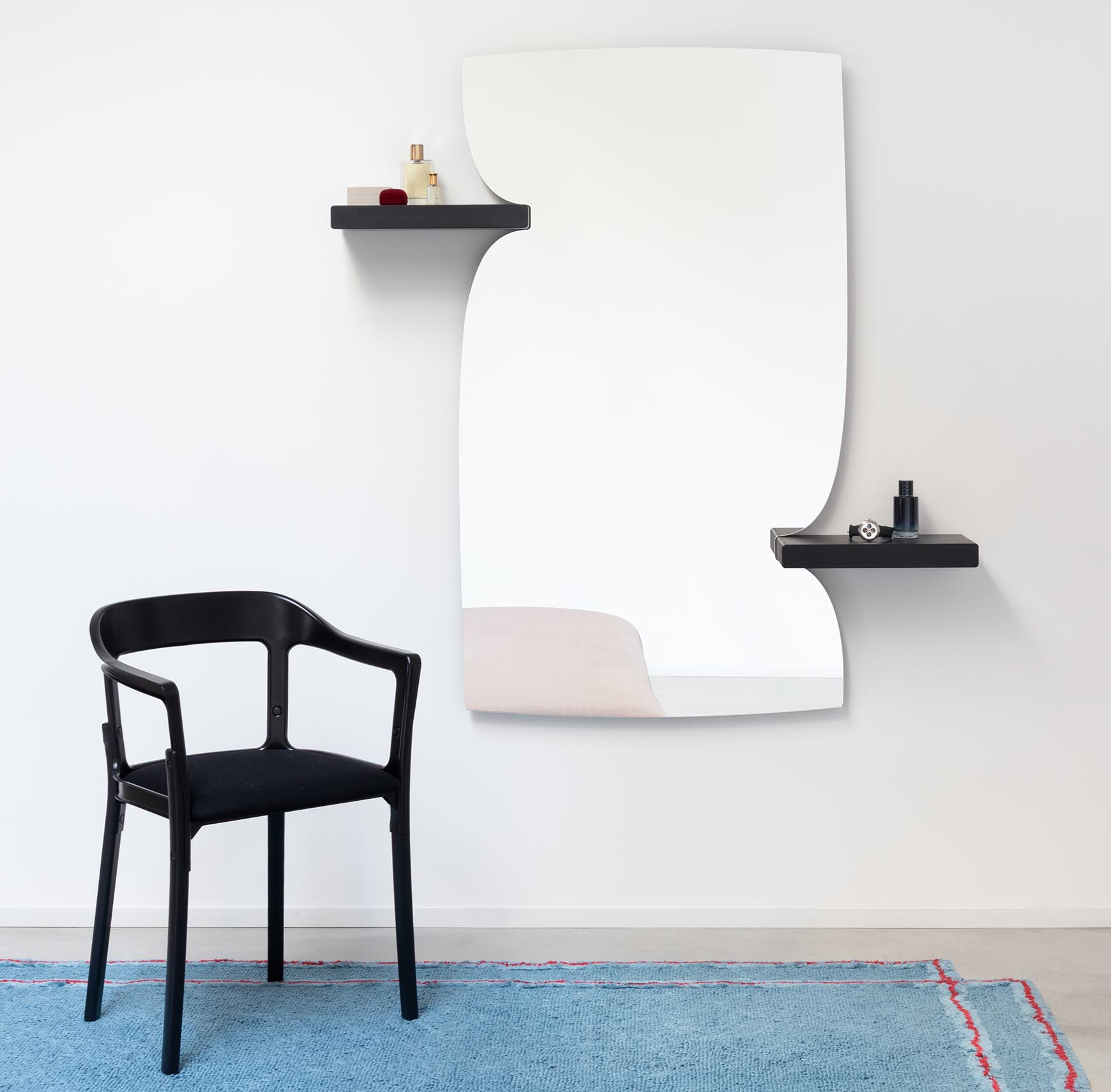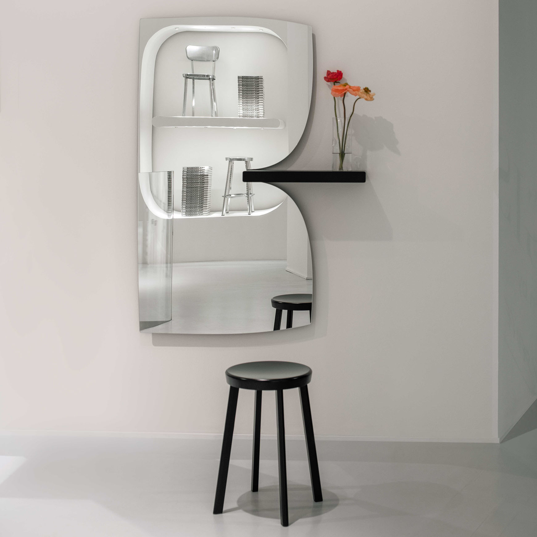 Étagères en frêne massif noir. Miroir avec pellicule de protection sur le dos. Le miroir avec une seule étagère peut être fixé sur les deux côtés courts.