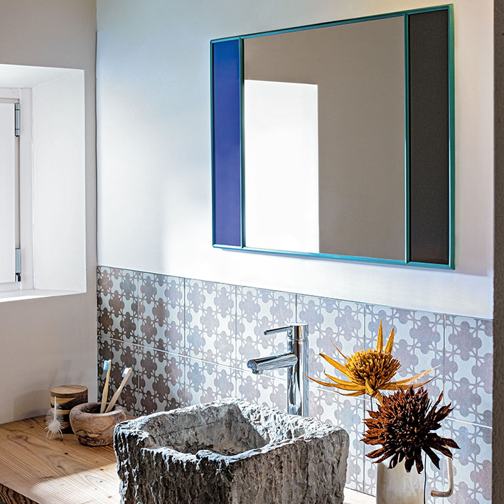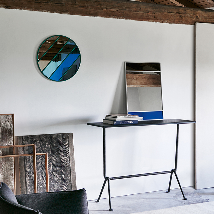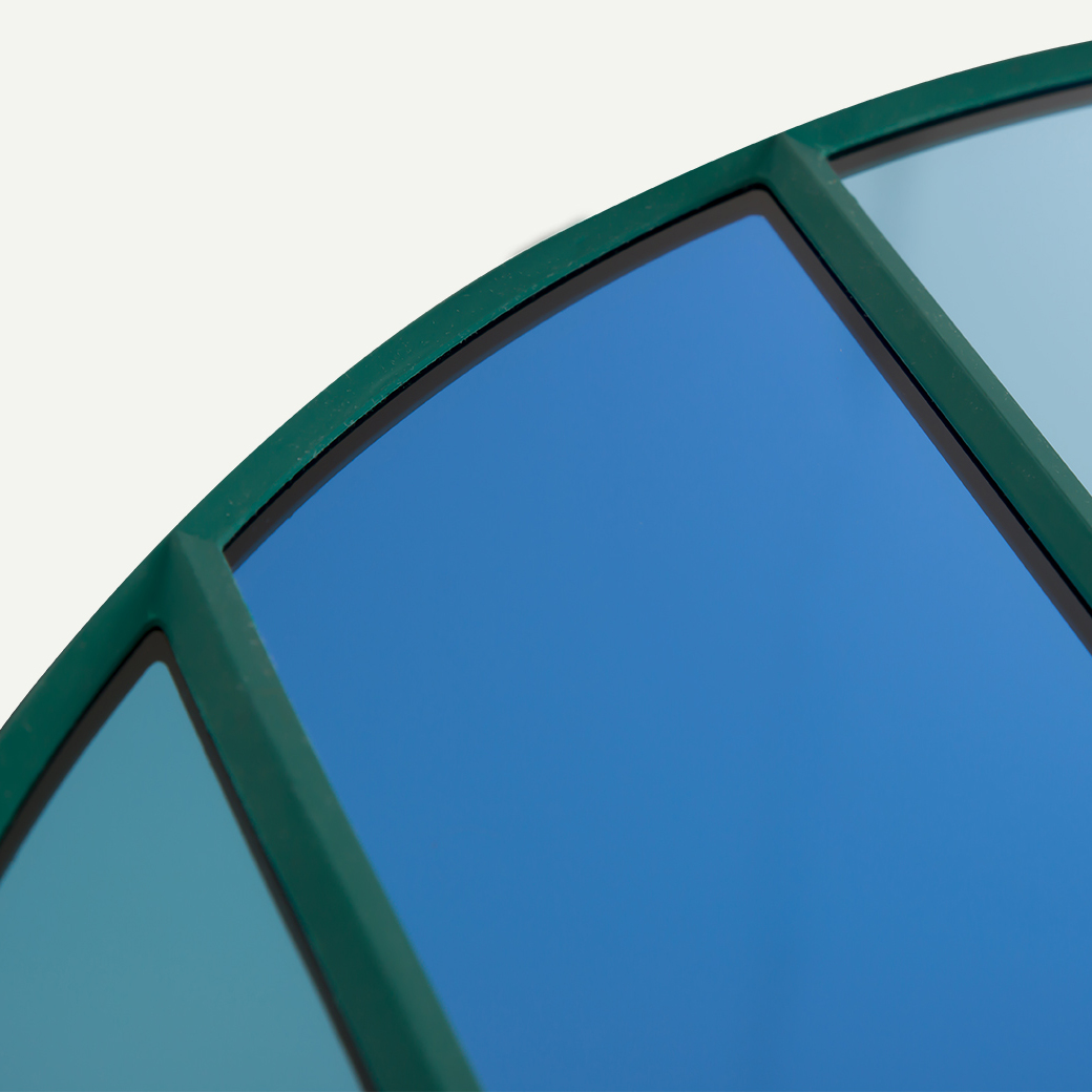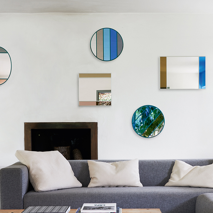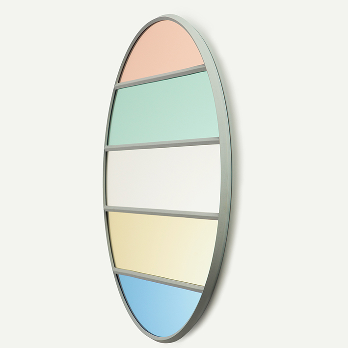 Cadre en caoutchouc. Miroir avec avec bandes colorées et pellicule plastique de protection sur le dos.
