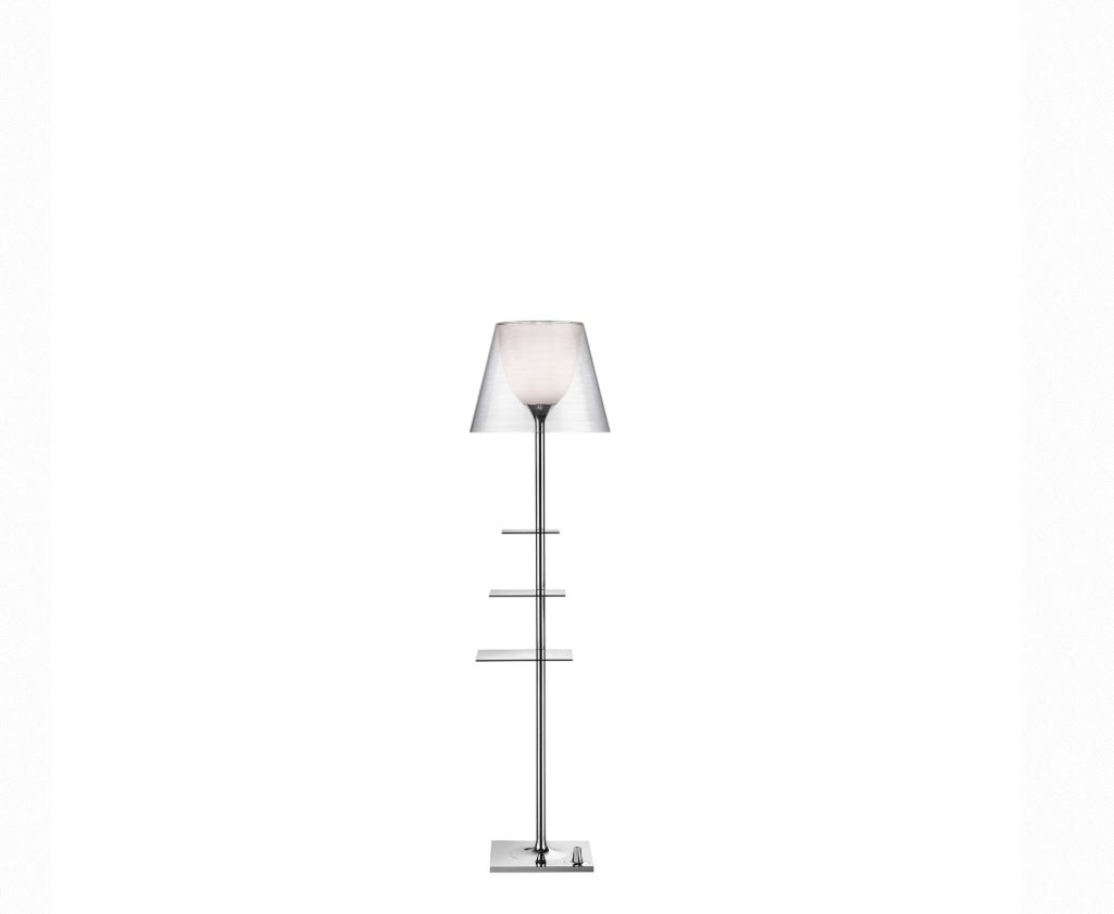 Lampadaire à lumière diffuse. Base, support de tige et support de diffuseur en zamac , diffuseur externe en tissu ou PVC transparent, gris fumé, métallisé gris ou métallisé bronze. Tablettes en acier inoxydable poli. Une prise USB placée sur la base permet de recharger les smartphone et les tablettes les plus courants (max 2A).