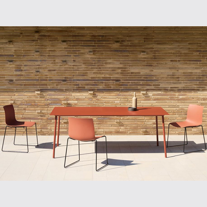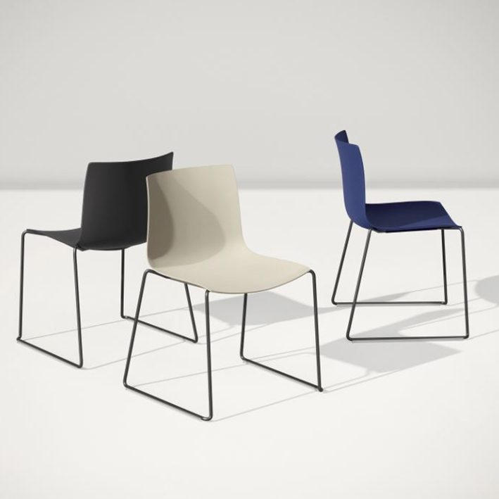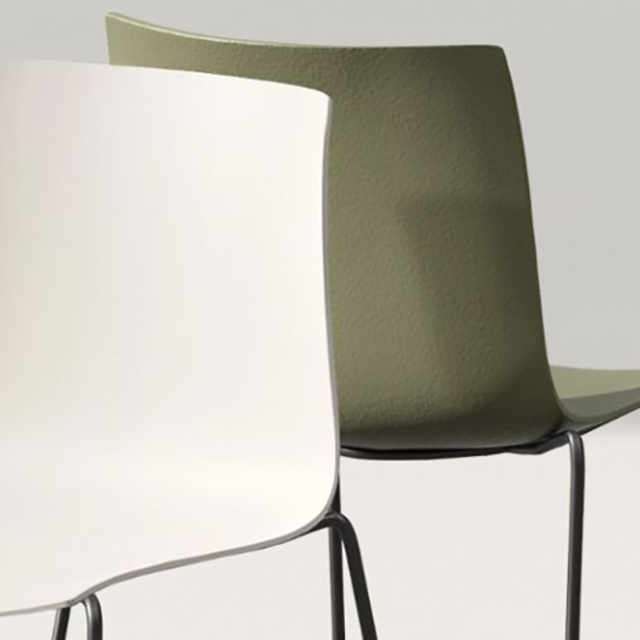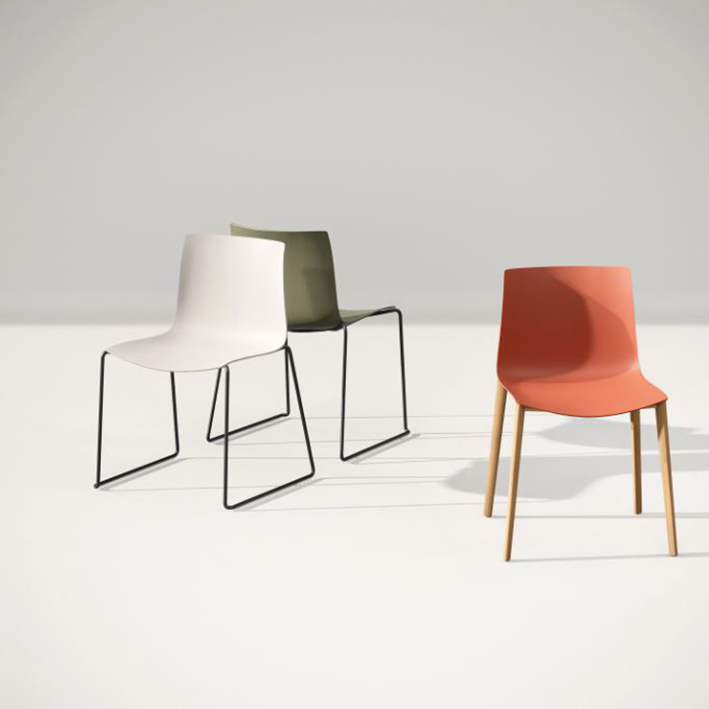 Piètement laqué ou chromé (4 pieds, bois ou luge), coque en plastique 100 % recyclé provenant d’un mélange de déchets post-consommation et post-industriels (8 coloris disponibles)
