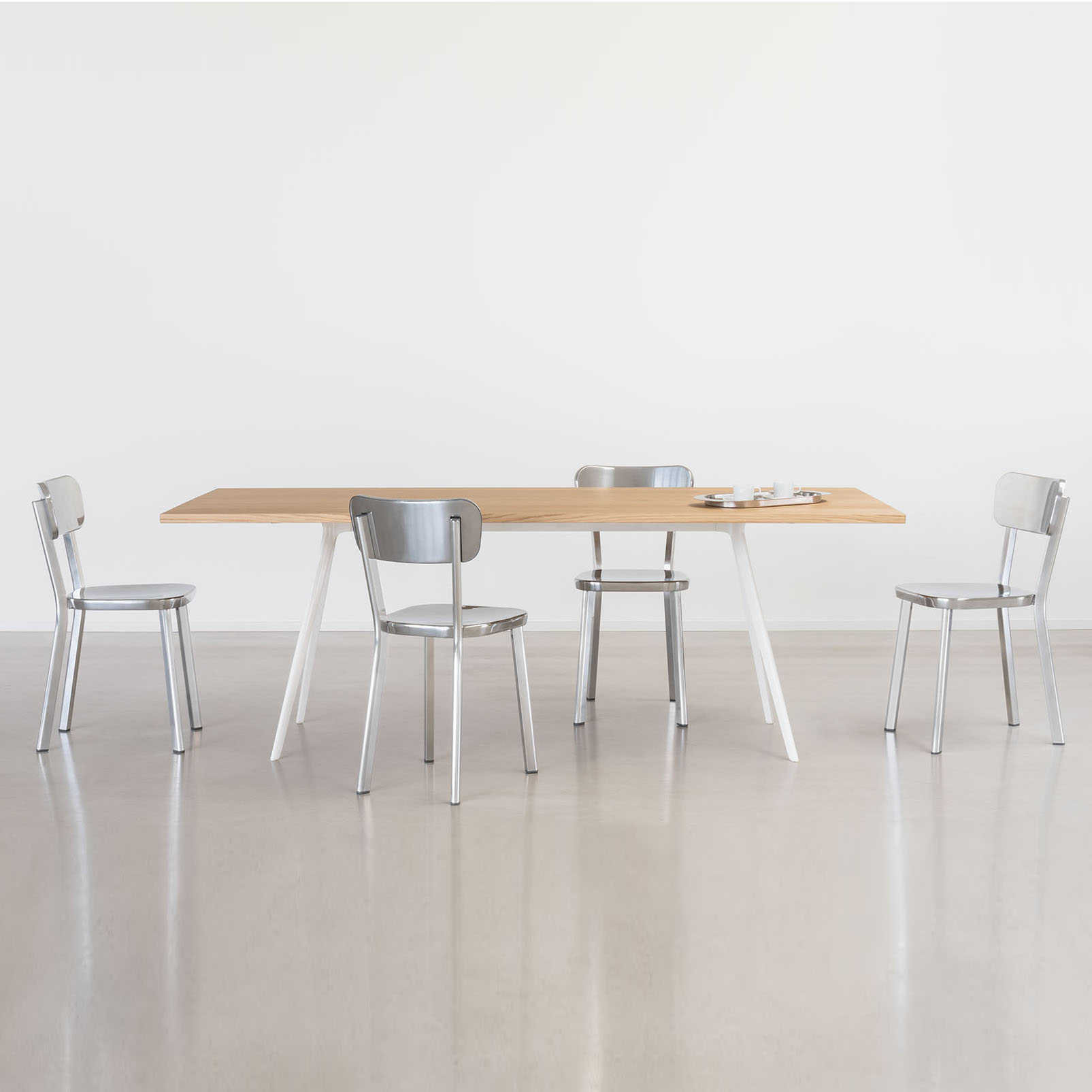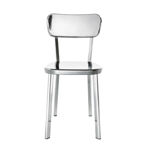 Pieds en aluminium poli. Assise et dossier en fonte d’aluminium poli. Non feu.