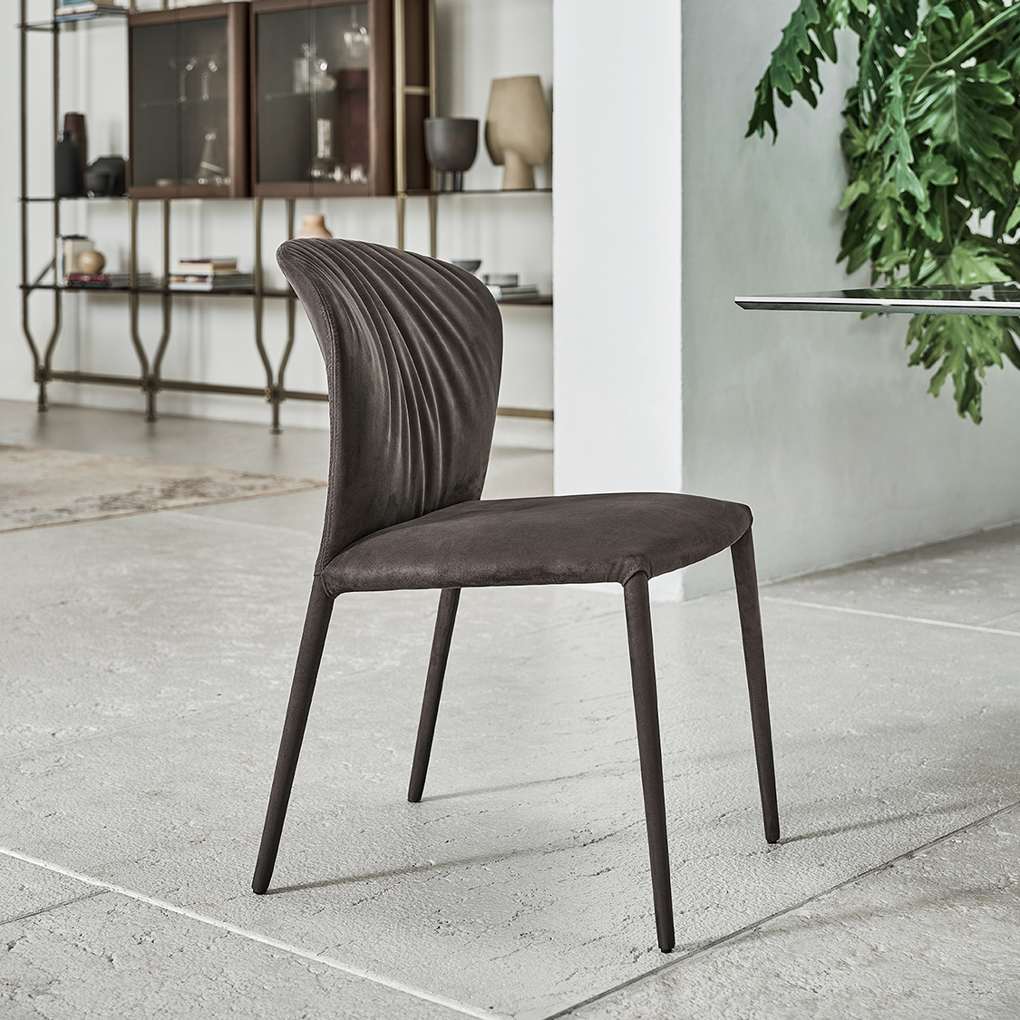 Rembourrée et revêtue de tissu, cuir, simili-cuir ou velours, piètement métal laqué ou revêtu.