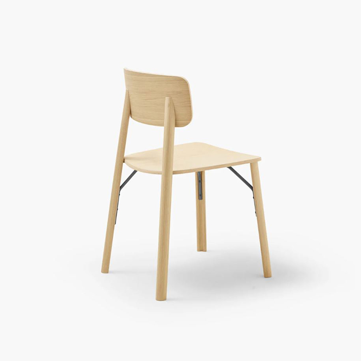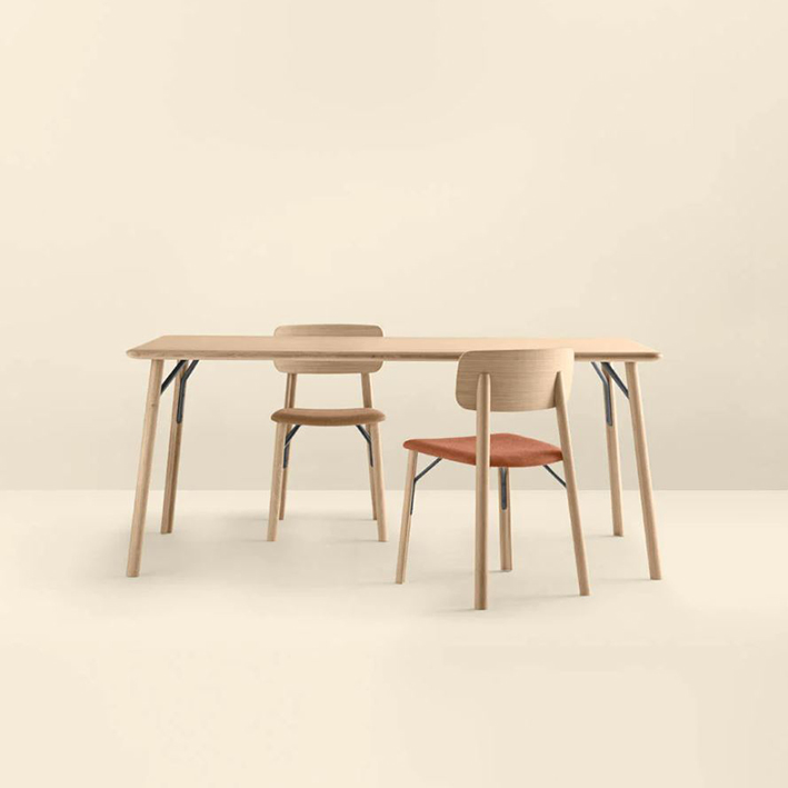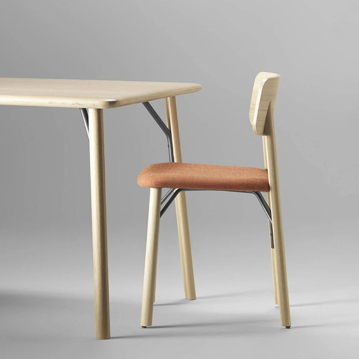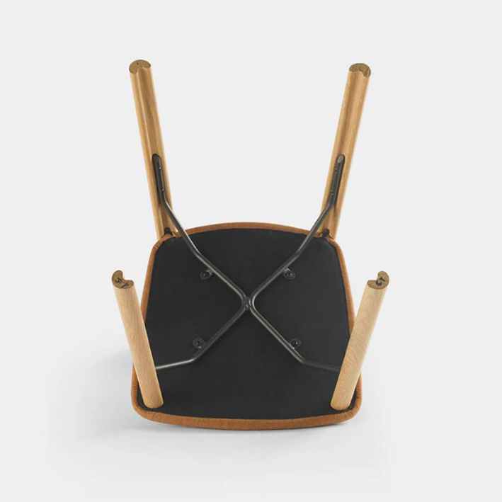 Chaise à structure en métal cintré logé dans une section bois massif en forme de haricot, tapissée ou non.
