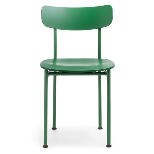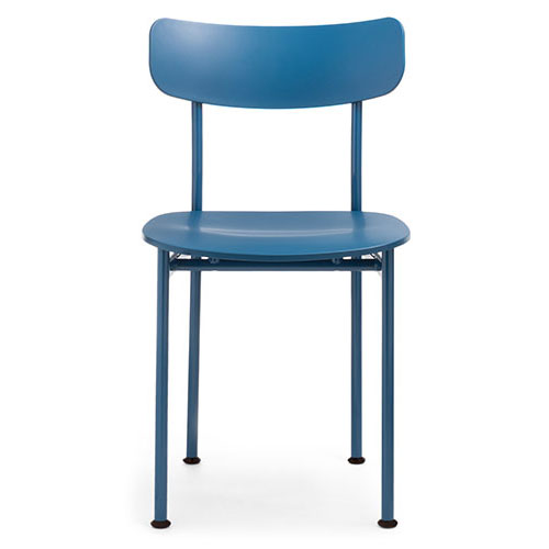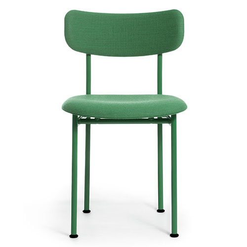 Structure en tube d’acier verni poli. Assise et dossier en polypropylène, multipli de hêtre naturel ou rembourrés et revêtus en tissu