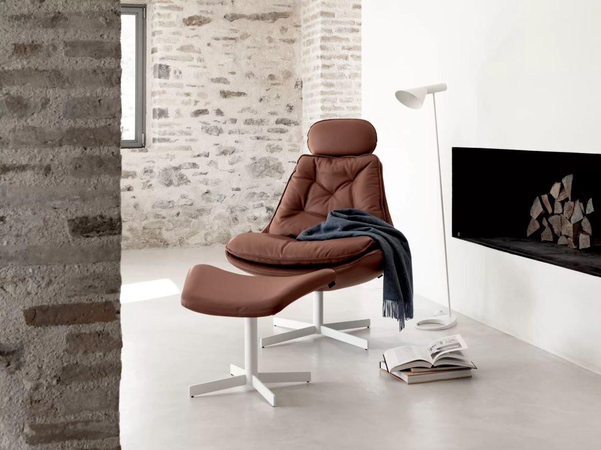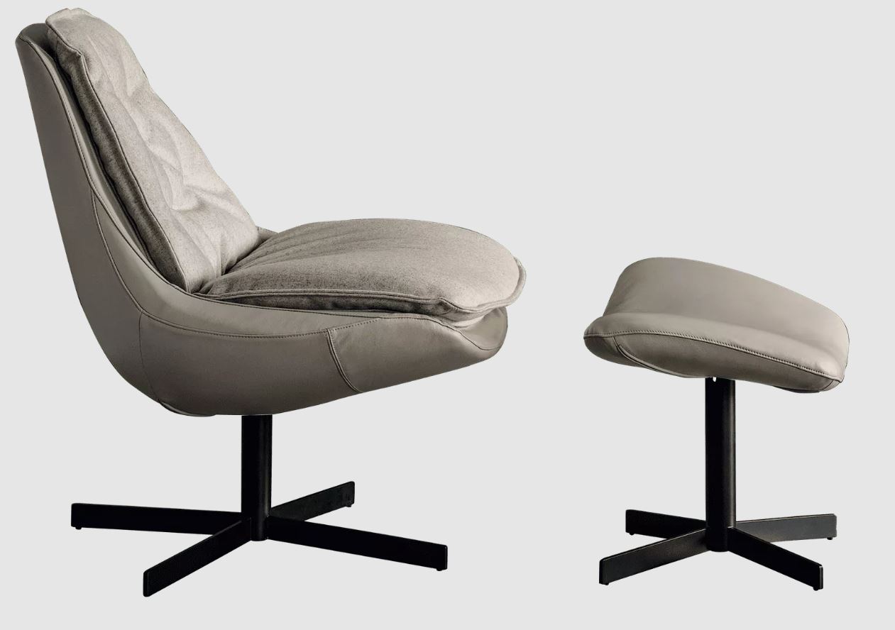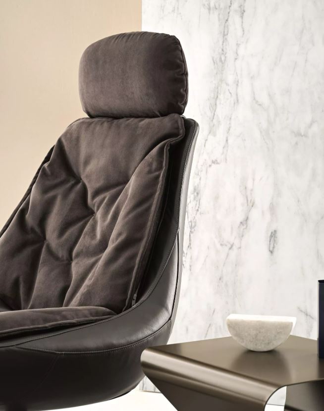 Fauteuil pivotant avec socle central en métal chromé ou laqué. Coque déhoussable et rembourrée en polyuréthane ignifugé. Revêtement cuir, simili-cuir ou tissu. Appuie-tête et repose-pieds en option.