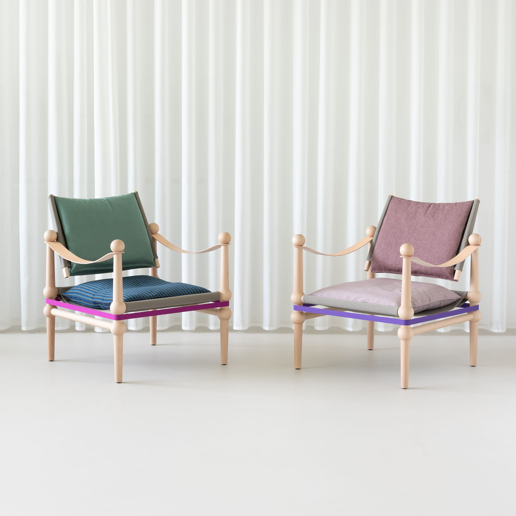 Structure en hêtre massif, teinté naturel ou aniline noir. Assise et dossier en tissu autoportant. Coussin assise et revêtement dossier en tissu déhoussable. Accoudoirs en cuir pleine fleur. Sangle de tension en polyamide.