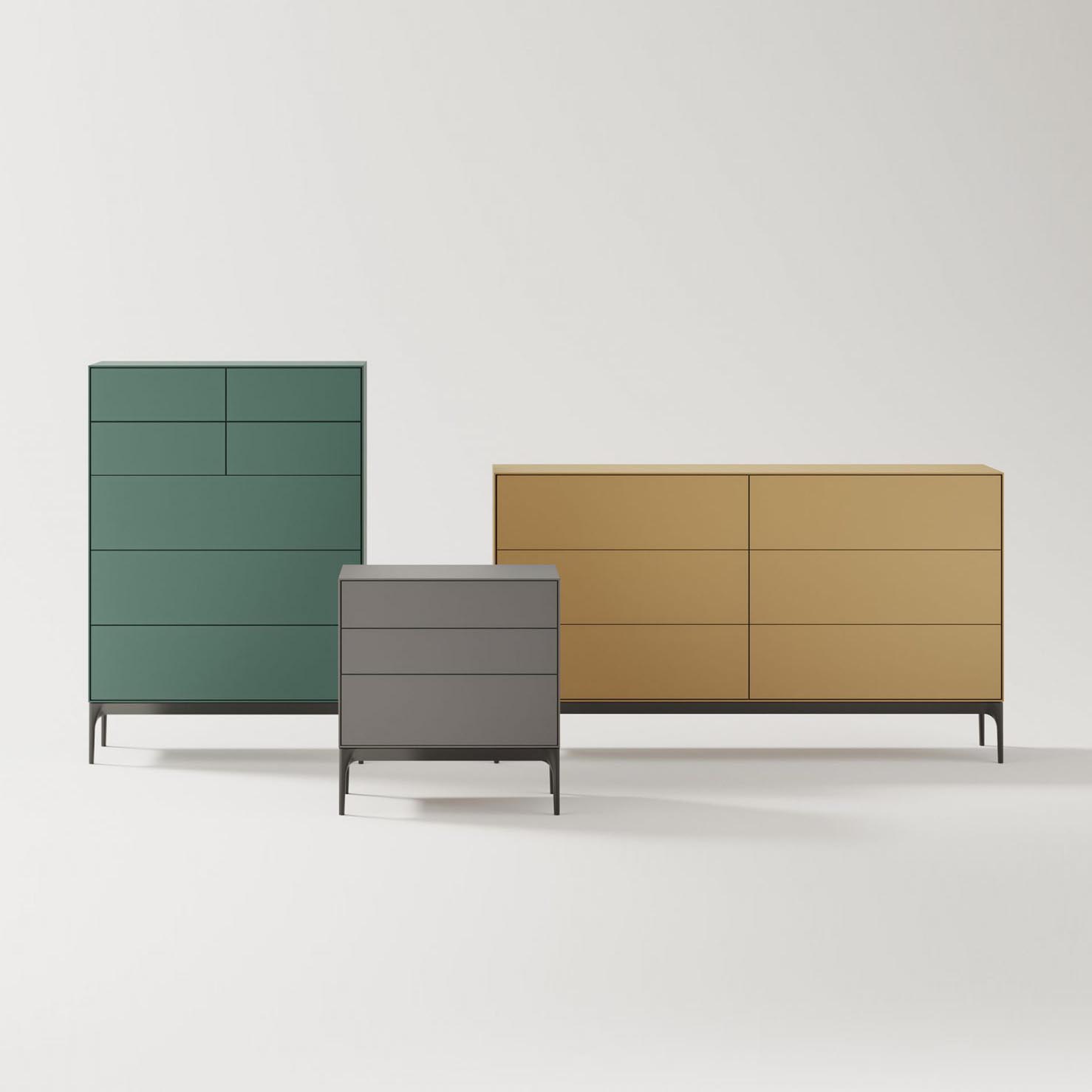 Structure et façades tiroirs en bois laqué (17 teintes) ou plaqué chêne, noyer (7 teintes)