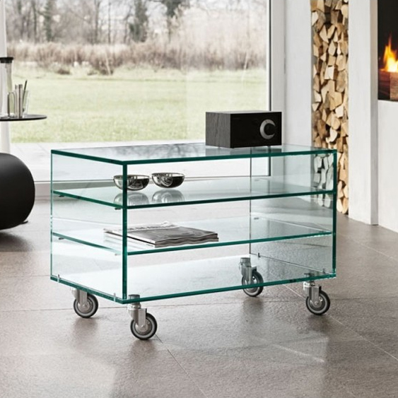 Verre transparent ou extra-light, roulettes. Casier optionnel chêne blanchi ou noyer canaletto