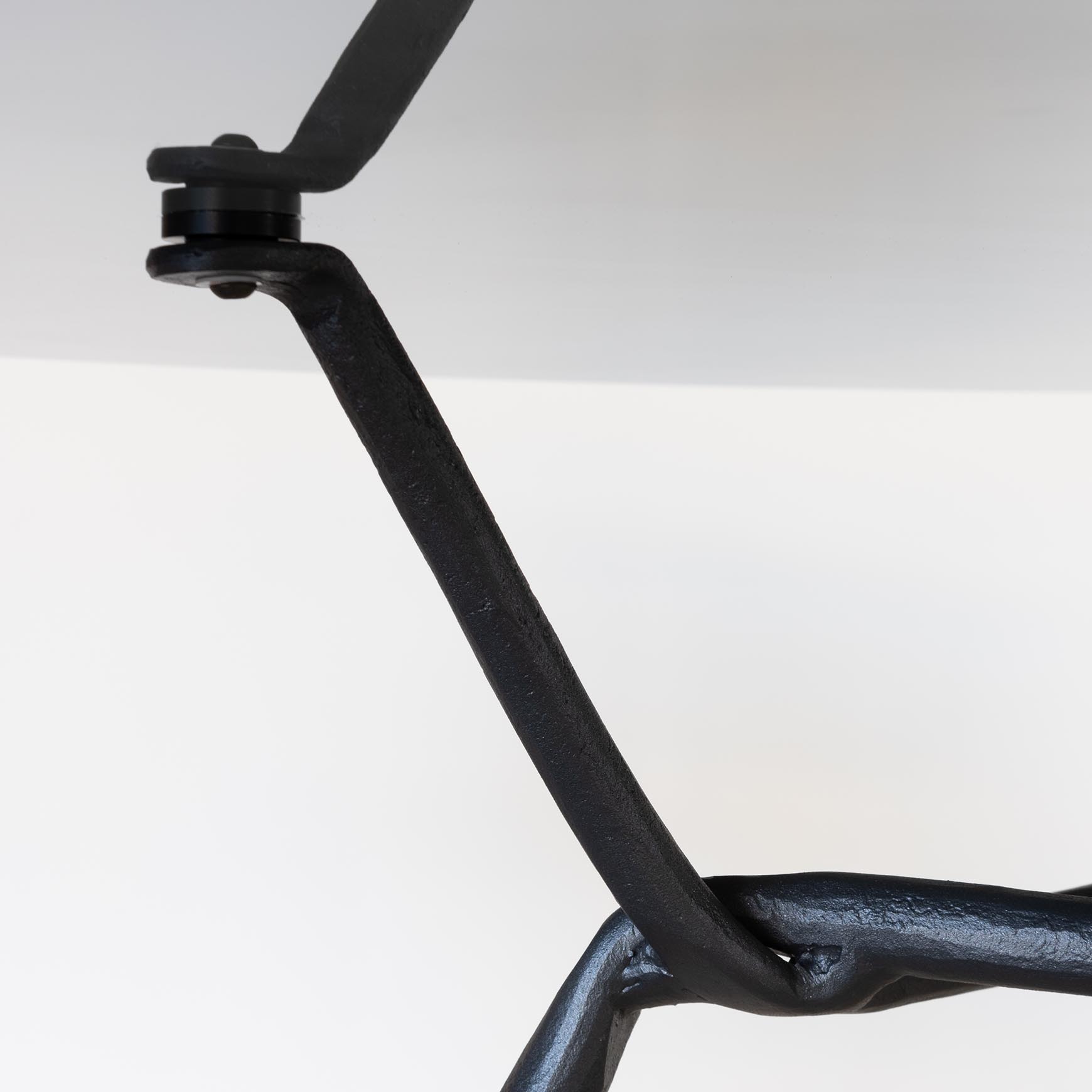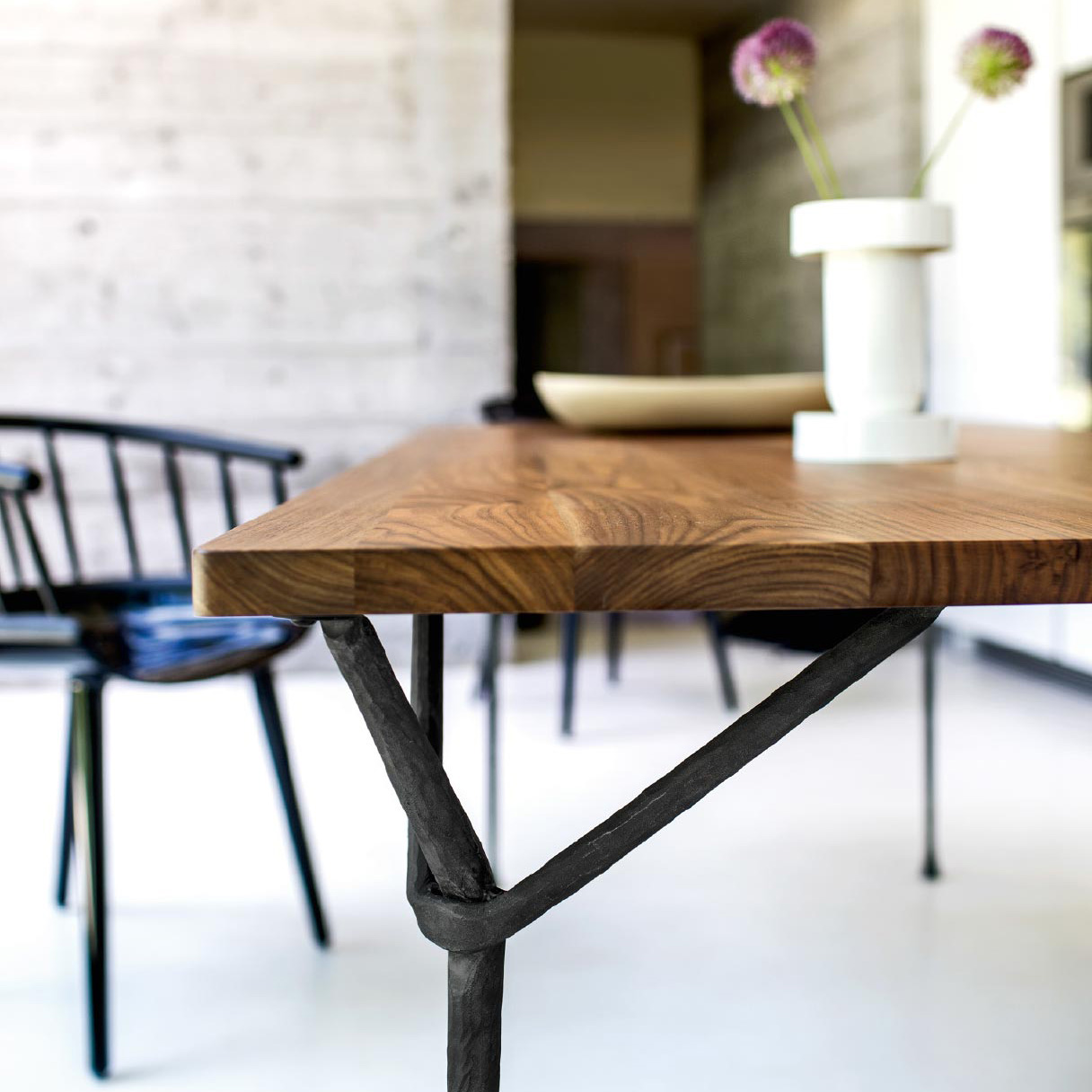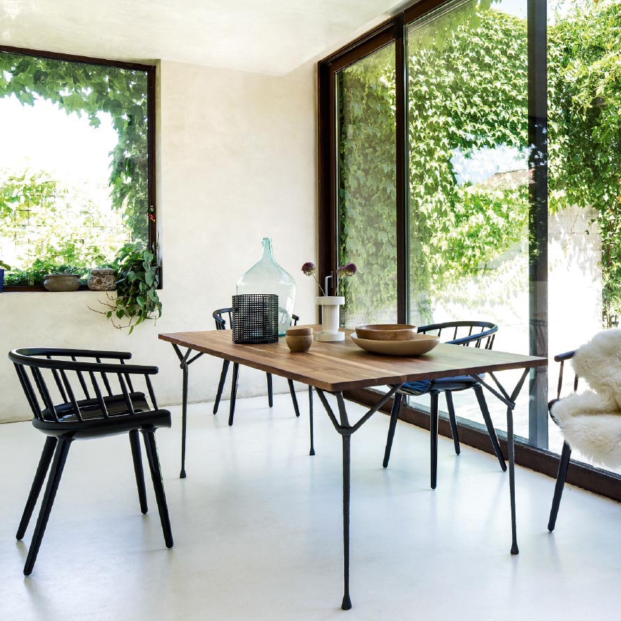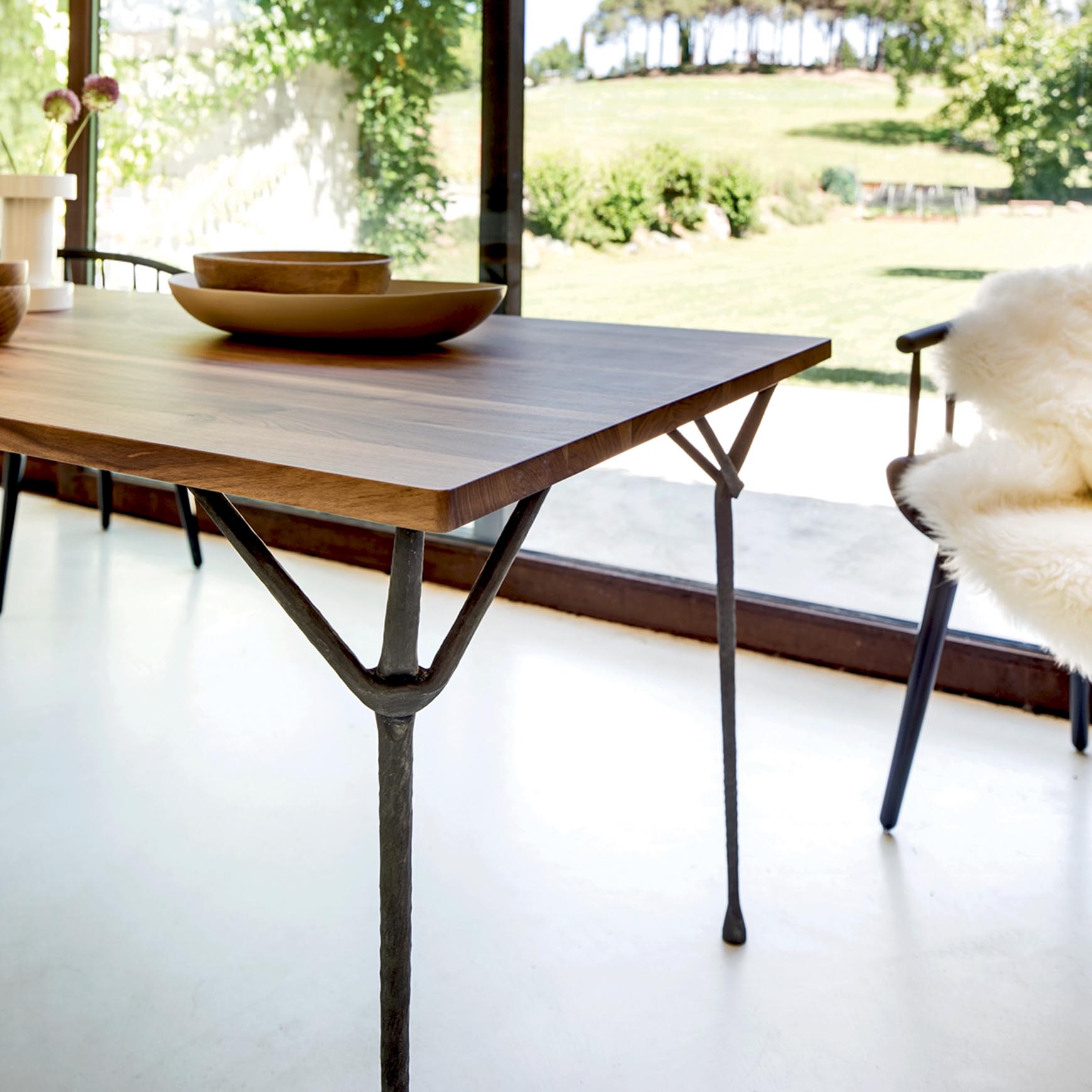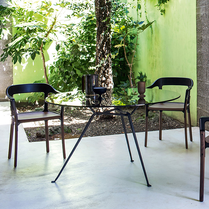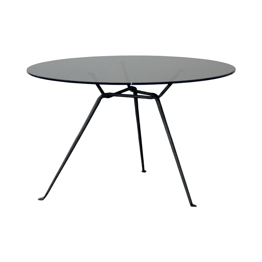 Structure en fer forgé verni en polyester. Plateaux en noyer américain massif ou en verre trempé.