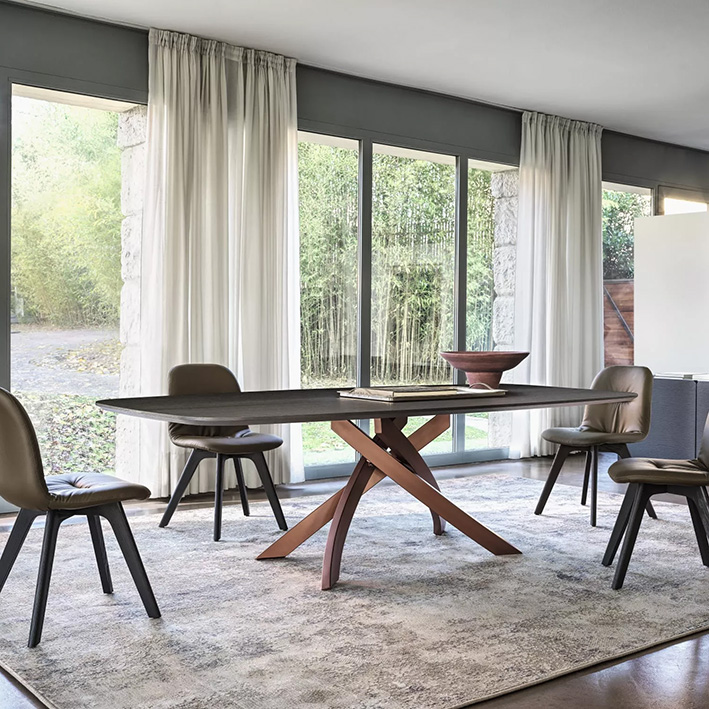 Structure et piètement en métal laqué. Plateau en verre rétrolaqué, verre dépoli anti-rayure, bois, céramique… Versions fixes ou à 2 rallonges